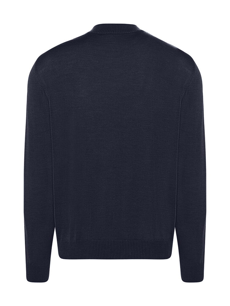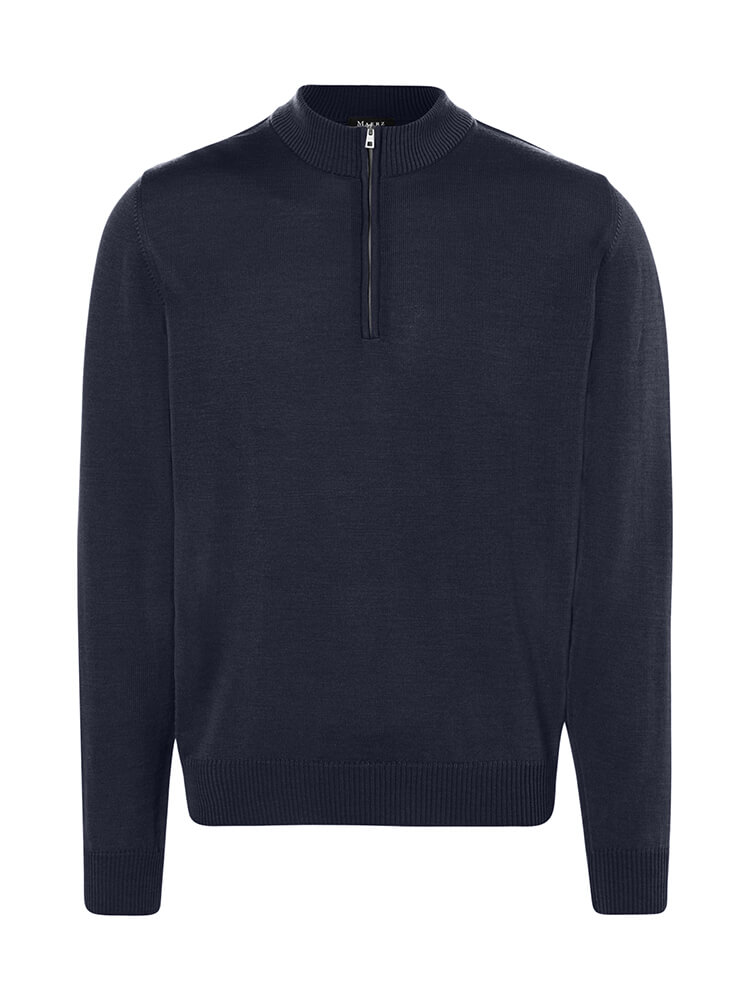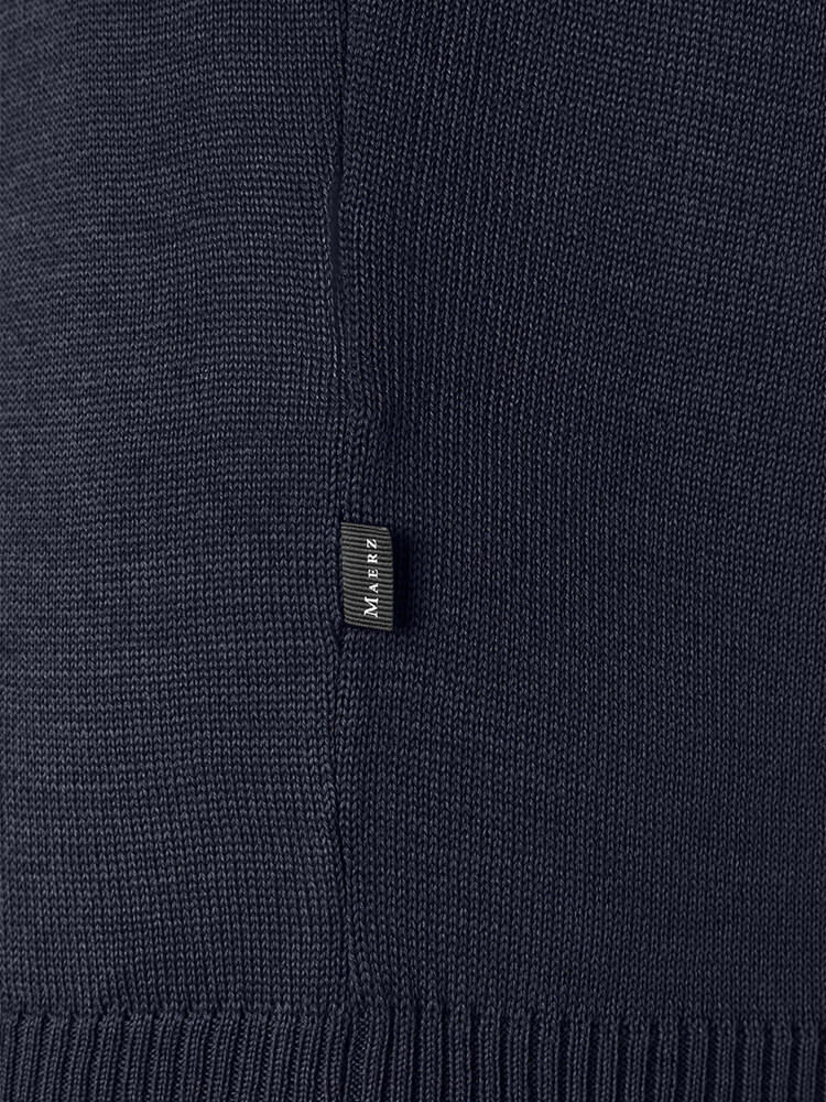 Uanset årstiden vil denne yderst stilfulde MAERZ strikpullover holde dig komfortabel på køligere aftener eller dage. Denne ensfarvede strikpullover i marineblå af 100 % merinould med en elegant Stående krave supplerer din garderobe og fremhæver din maskuline silhuet. Uanset om det er i fritiden eller på kontoret, er du garanteret en god følelse med denne let tilpassede trøje fra MAERZ.
