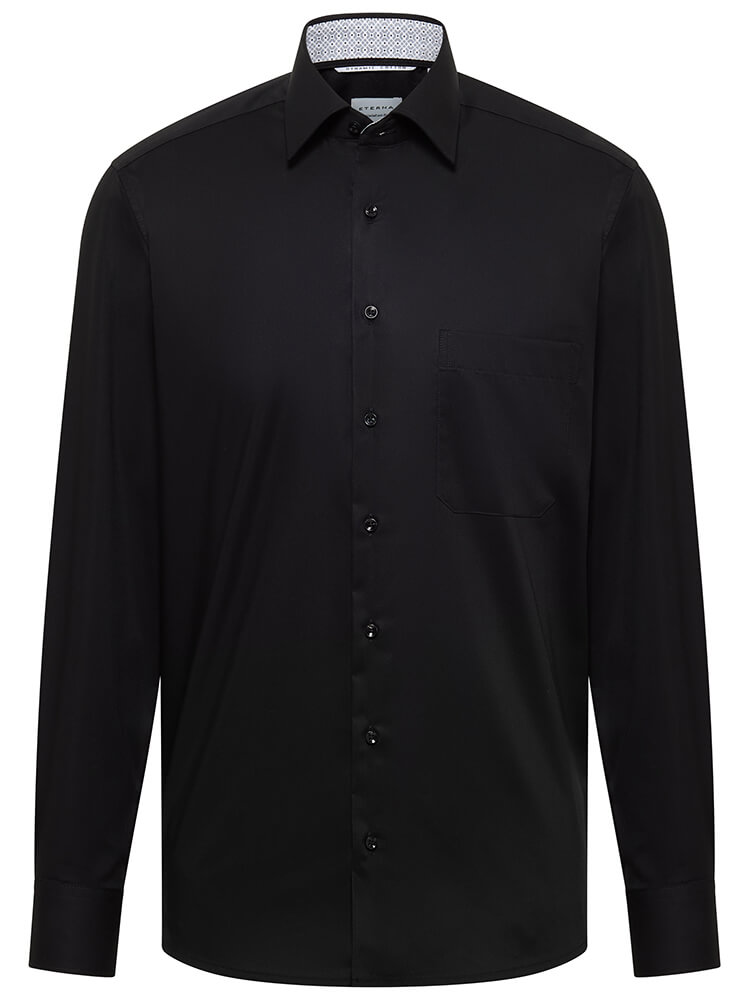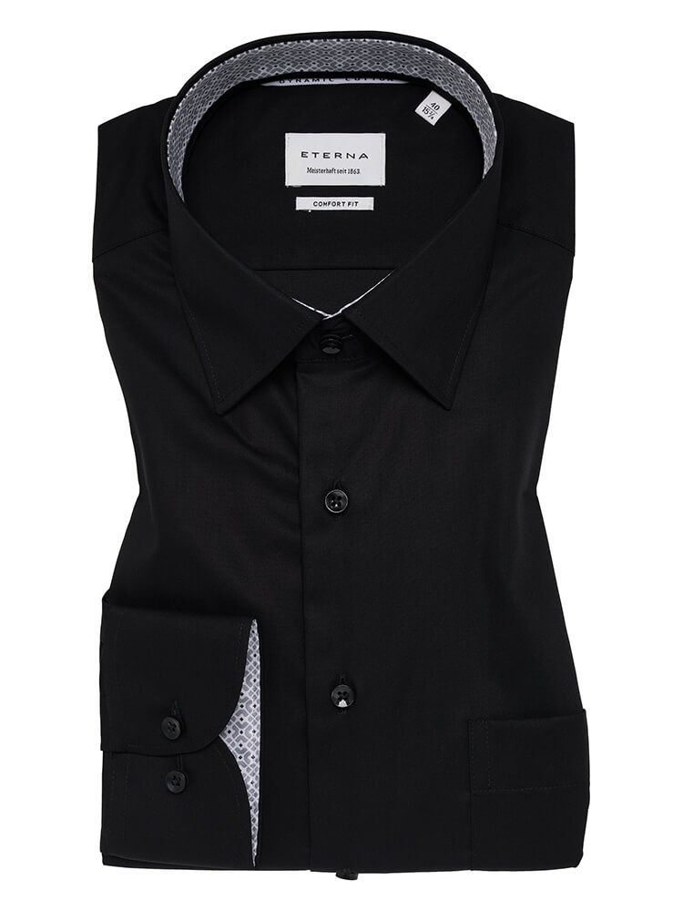Den komfortable business skjorte fra ETERNA Comfort Fit kollektionen repræsenterer den sofistikerede og modebevidste mand af i dag. En klassisk pasform kombineret med moderigtige produktdetaljer giver en høj komfort og gør denne skjorte til en mester i at kombinere. En almindelig herreskjorte i farven sort skjorte til mænd bør ikke mangle i enhver mands garderobe og kan bæres med den elegante og tidløse Kent krave til enhver lejlighed og i hverdagen. Denne ETERNA Comfort Fit skjorte til mænd ser bedst ud med et matchende slips og en bred slips knude.