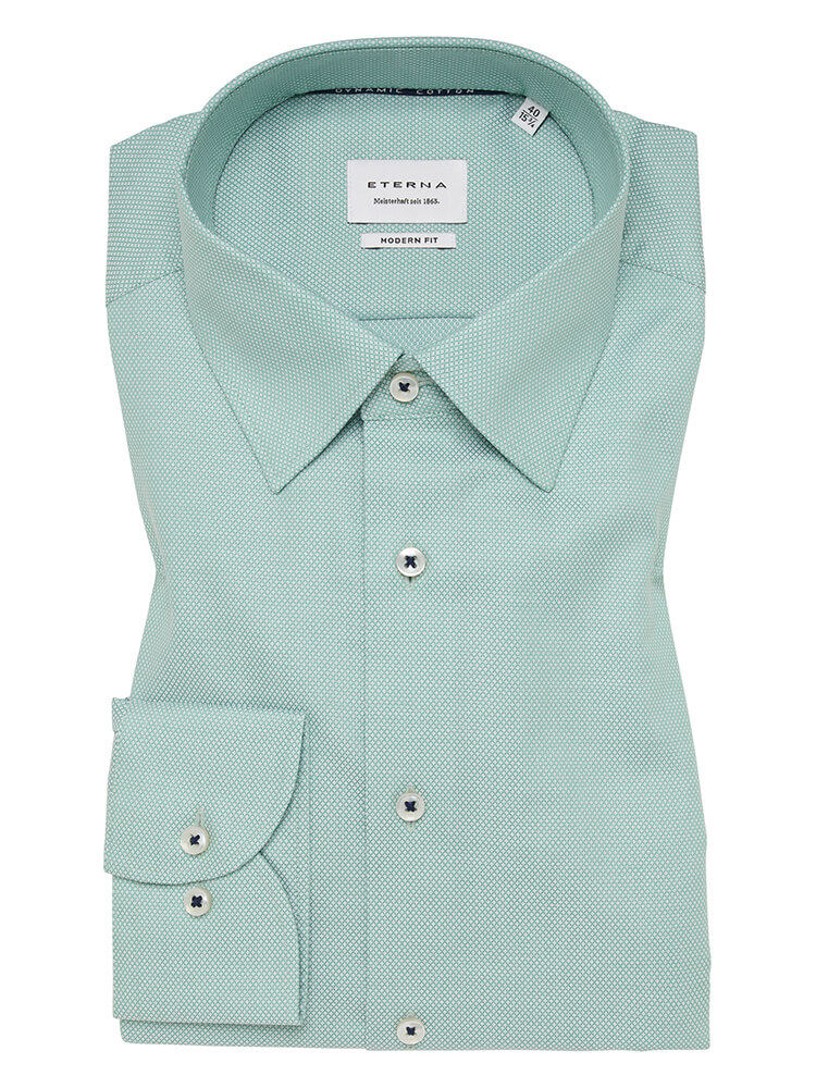 Den moderne business skjorte fra ETERNA Modern Fit kollektionen repræsenterer den selvsikre og modebevidste mand af i dag. En modern pasform kombineret med førsteklasses detaljer lover høj komfort og gør denne skjorte til en kombinationskunstner. En almindelig herreskjorte i farven grøn skjorte til mænd bør ikke mangle i enhver mands garderobe og kan bæres med den elegante og tidløse Kent krave til enhver lejlighed og i hverdagen. Denne ETERNA Modern Fit skjorte til mænd ser bedst ud med et matchende slips og en bred slips knude.