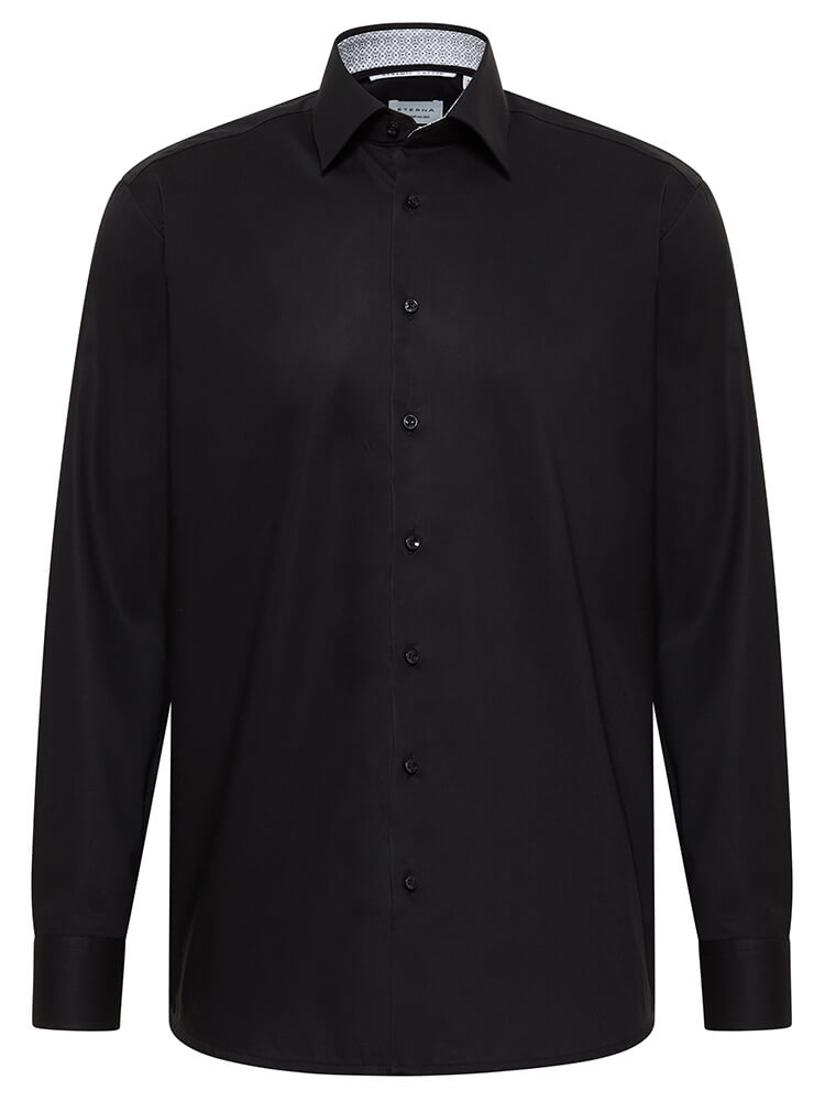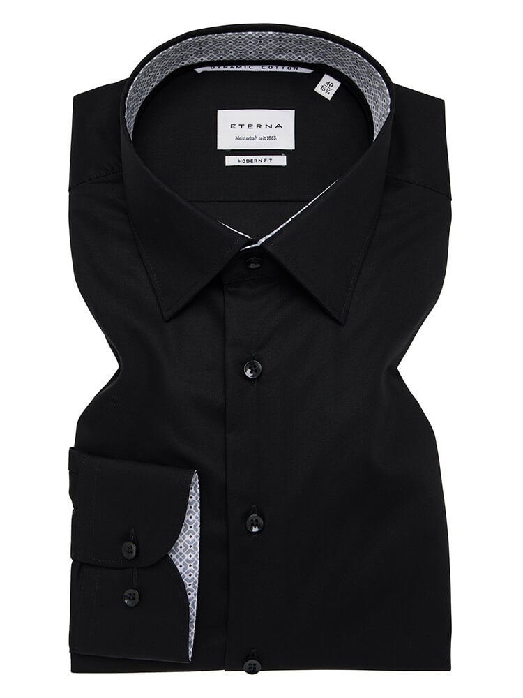 Den moderne business skjorte fra ETERNA Modern Fit kollektionen repræsenterer den selvsikre og modebevidste mand af i dag. En modern pasform kombineret med førsteklasses detaljer lover høj komfort og gør denne skjorte til en kombinationskunstner. En almindelig herreskjorte i farven sort skjorte til mænd bør ikke mangle i enhver mands garderobe og kan bæres med den elegante og tidløse Kent krave til enhver lejlighed og i hverdagen. Denne ETERNA Modern Fit skjorte til mænd ser bedst ud med et matchende slips og en bred slips knude.