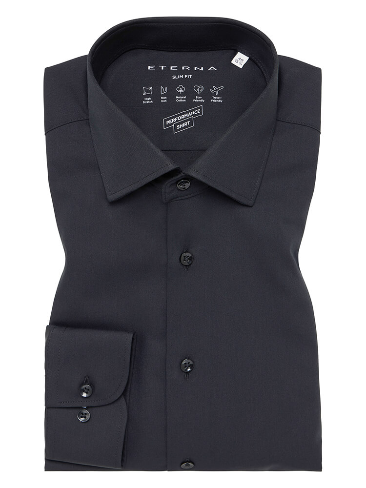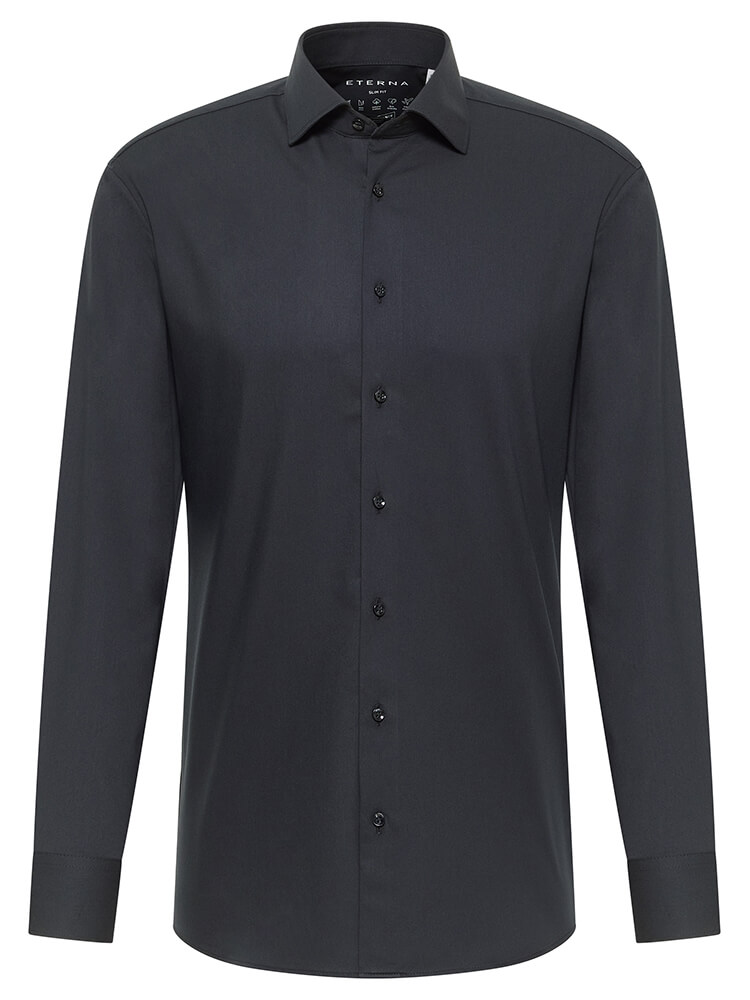 Den elegante business skjorte fra ETERNA Slim Fit kollektionen repræsenterer den slanke, modebevidste mand af i dag. En slank pasform kombineret med moderigtige detaljer lover høj komfort og gør denne skjorte til en kombinationskunstner. En almindelig herreskjorte i farven sort skjorte til mænd bør ikke mangle i enhver mands garderobe og kan bæres med den elegante og tidløse Kent krave til enhver lejlighed og i hverdagen. Denne ETERNA Slim Fit skjorte til mænd ser bedst ud med et smalt slips og en lille slips knude.Oplysninger fra producenten: