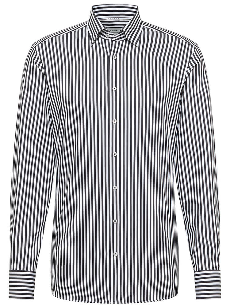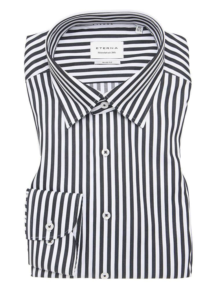 Den elegante business skjorte fra ETERNA Slim Fit kollektionen repræsenterer den slanke, modebevidste mand af i dag. En slank pasform kombineret med moderigtige detaljer lover høj komfort og gør denne skjorte til en kombinationskunstner. En stribede herreskjorte i farven sort skjorte til mænd bør ikke mangle i enhver mands garderobe og kan bæres med den elegante og tidløse Under-Button-down krave til enhver lejlighed og i hverdagen. Denne ETERNA Slim Fit skjorte til mænd ser bedst ud med et smalt slips og en lille slips knude.Oplysninger fra producenten: